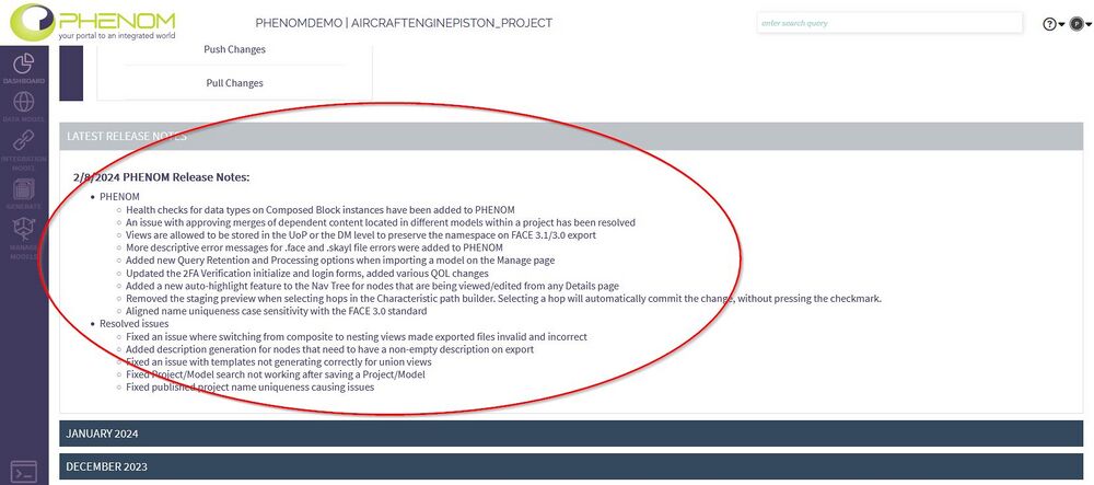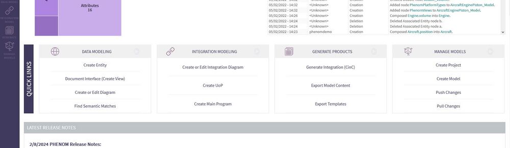 PHENOM's Dashboard is the first screen users will see when they log in. The Dashboard communicates the latest general analytics regarding the core model, recent changes to the model, and the most recent as well as archived Release Notes, containing a summary of the latest features added to PHENOM. The dashboard also provides a series of Quick Links - these are common actions intended to help the novice user find what they need easily.
