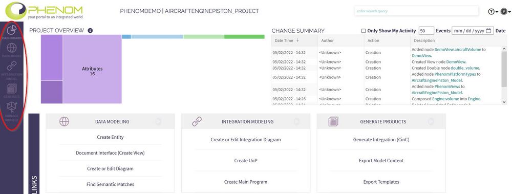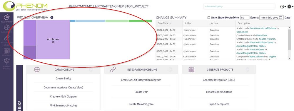 Across the top of the dashboard, you see the project overview. This is a live count of the number of entities, attributes, and views currently managed in your branch. The shapes, sizes and proportions of the regions in the overview can provide a high-level idea of model quality and how the model is currently used.
