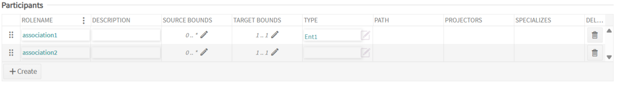 To add a new associated entity to an entity, click the create button that appears at the bottom of the associated entities section to add two new rows. Associated Entities require a valid name and type. The source and target bounds will show the FACE(R) technical standard by default.
