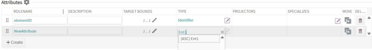 To add a new attribute to an Entity, click the create button that appears at the bottom of the attributes section to add a new row. Attributes require a valid name and type. The target bounds will show the FACE(R) technical standard by default.
