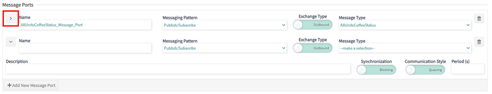 Existing Message Ports are collapsed by default for compactness. Each row can be expanded by clicking the > icon. A Message Port can be removed by clicking the trashcan icon.